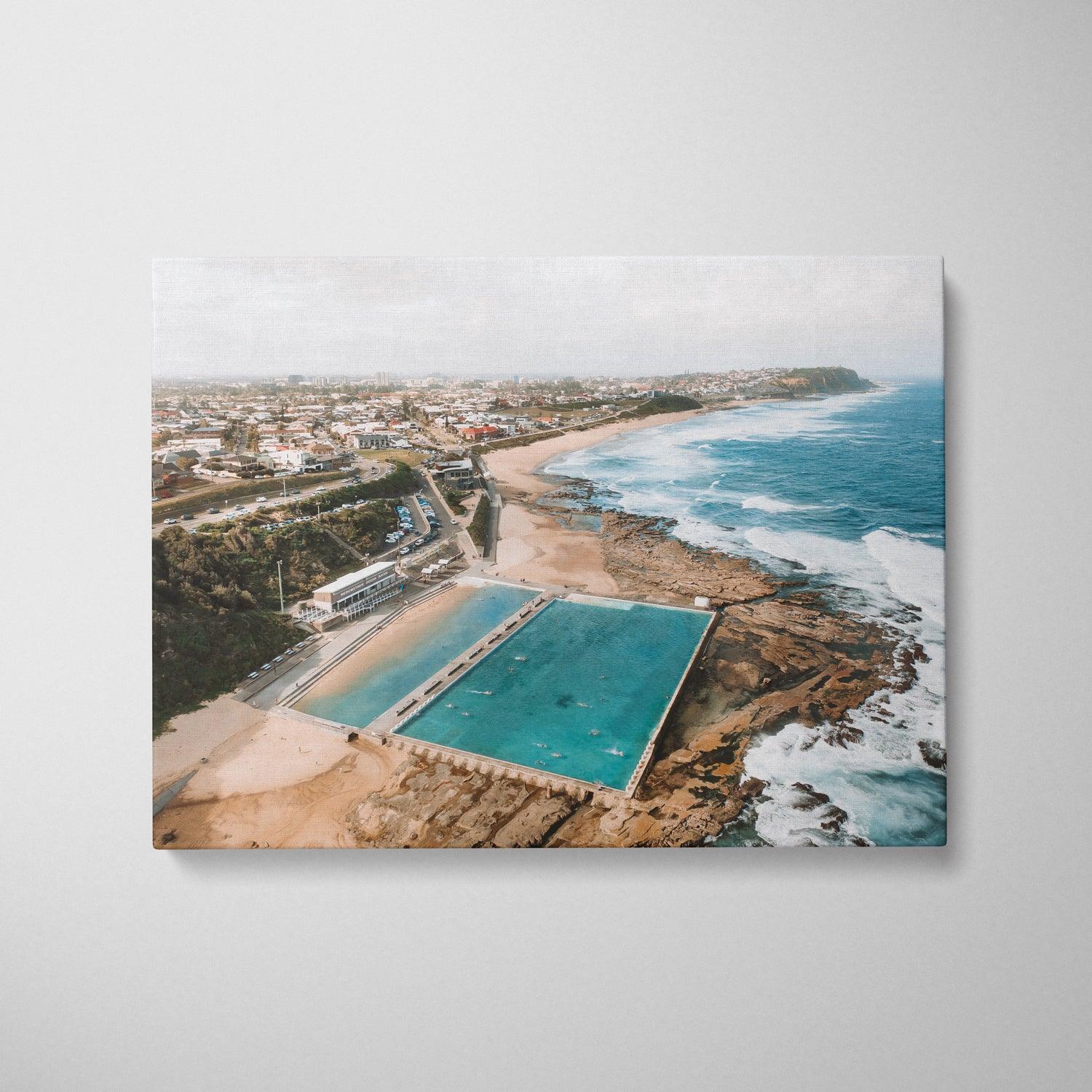 Aerial perspective of Merewether baths captured from a drone.