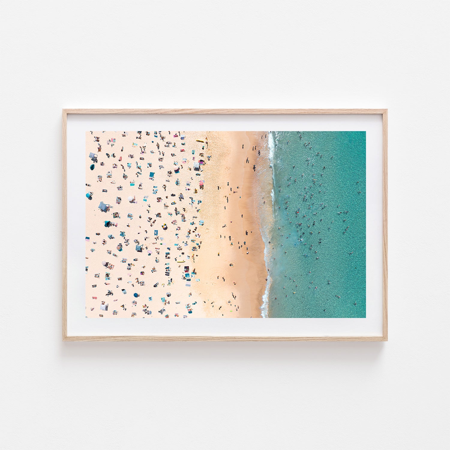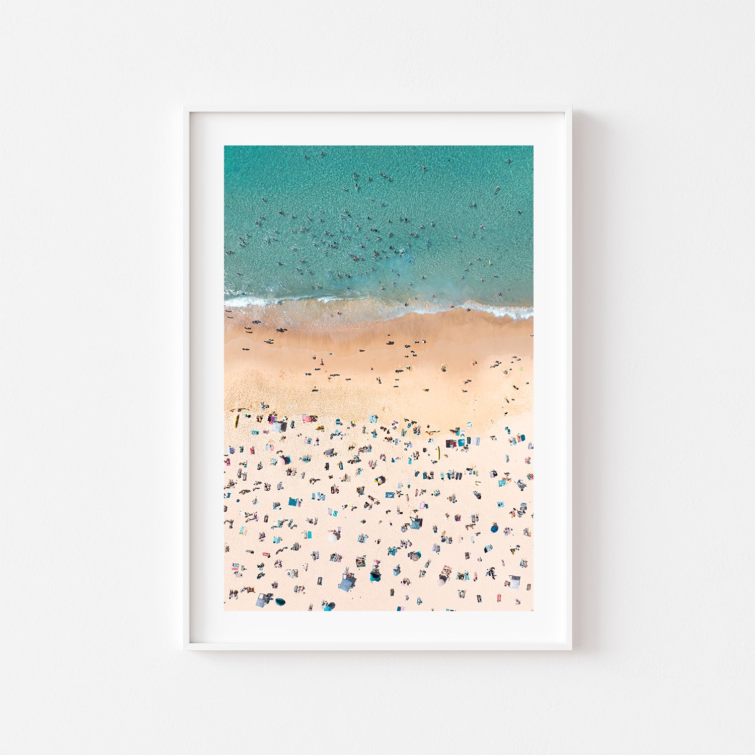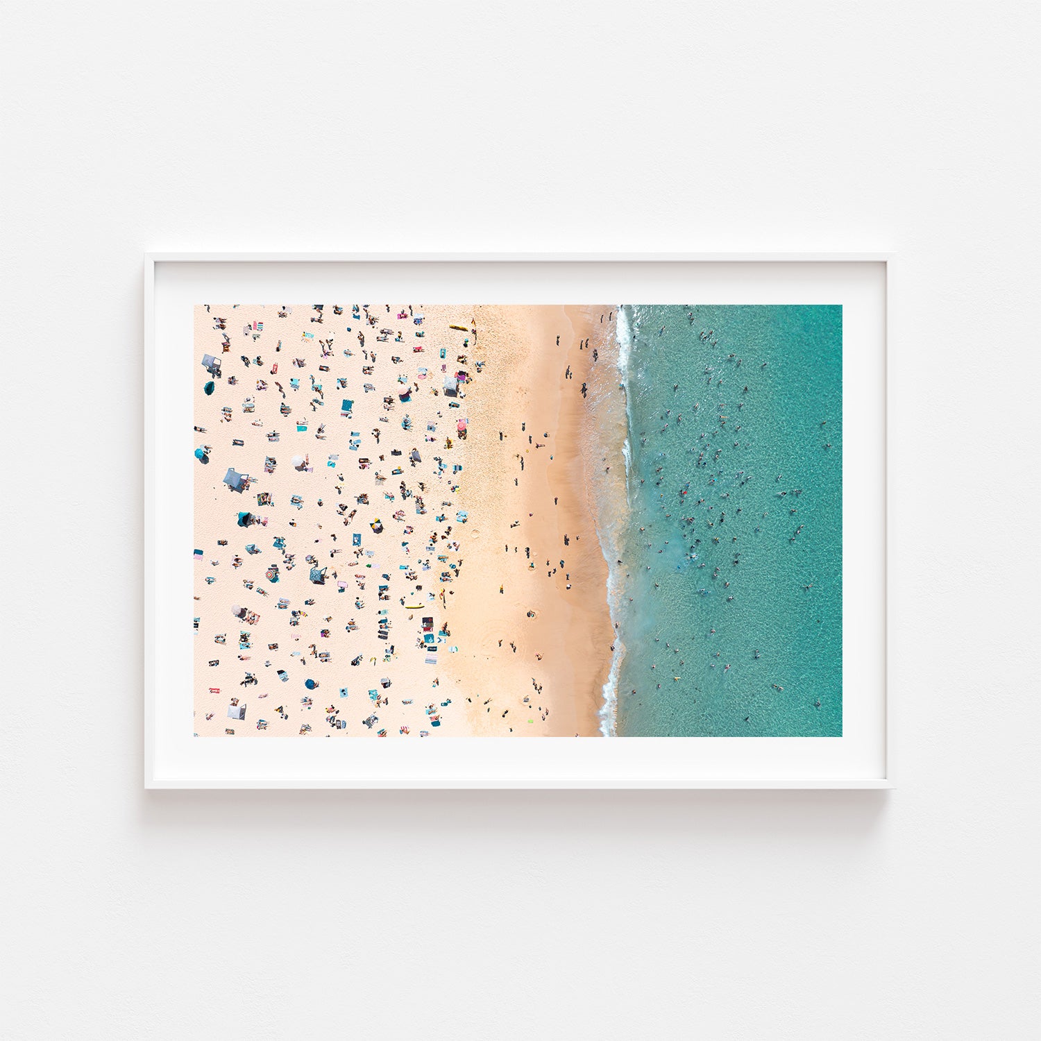 Bondi Bathers is a classic top-down aerial photograph capturing the timeless beauty of Bondi Beach, with people scattered across golden sand and drifting through clear blue waters. This iconic coastal wall art print blends texture, colour, and everyday beach life into a vibrant yet calming composition that celebrates Sydney’s most famous shoreline. Perfect for coastal homes, modern interiors, and lovers of Australian beach photography. This art print is available as an unframed photo print or as a framed, ready-to-hang wall art.