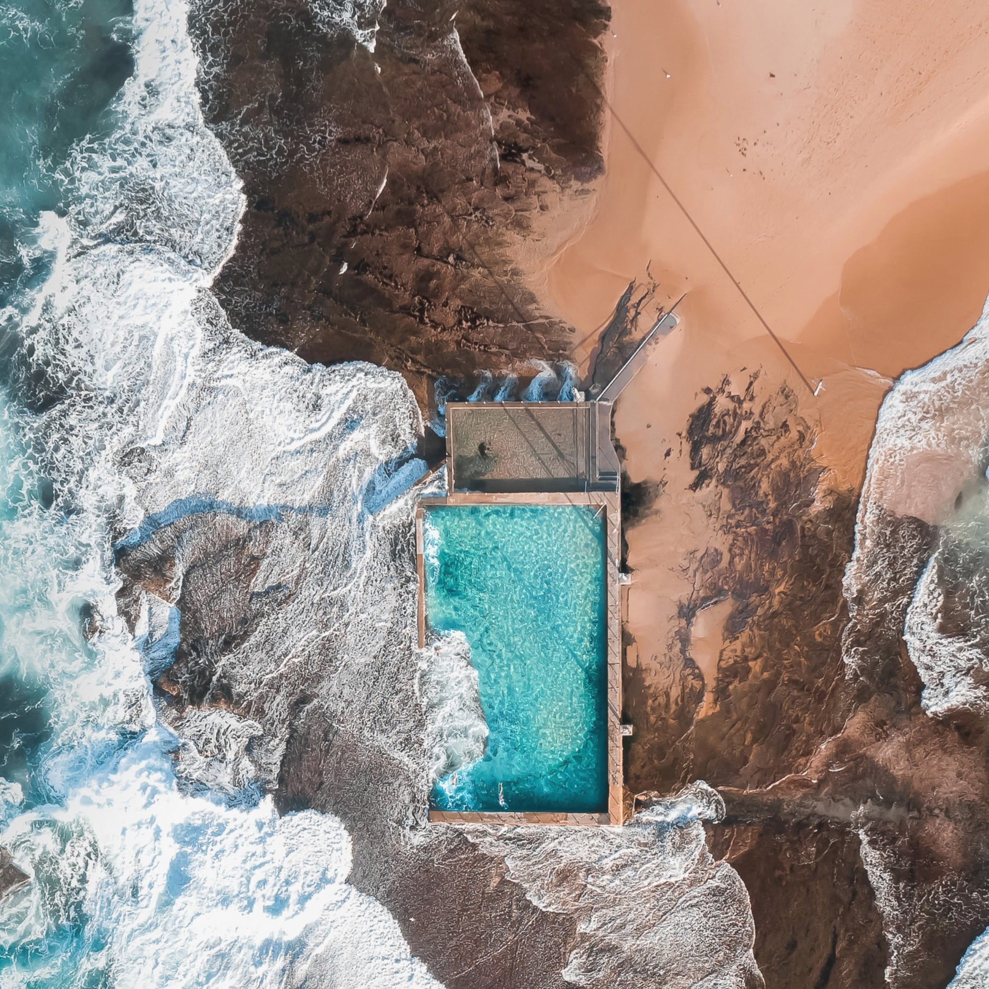 Mona Vale Rock Pool is situated on the tip of a sand spit near the Northern end of Mona Vale Beach. The photo was taken during a 6ft+ swell that can be seen washing over the rock platform around the pool, making the calm waters shine bright like a diamond.