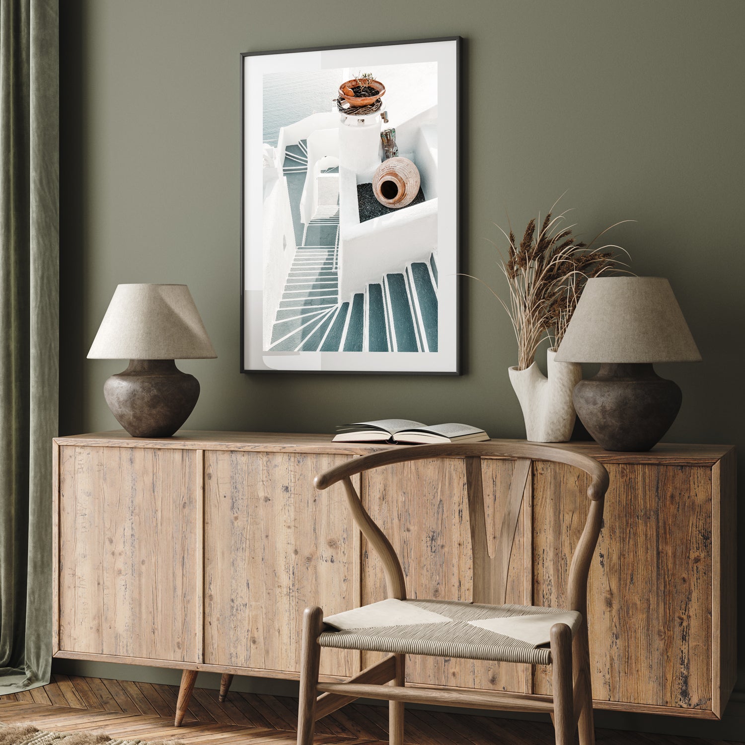 This Santorini Stairways Art Print is part of our Greece curated collection. Photographed in Santorini, Greece. This art print is available as an unframed photo print or as framed, ready-to-hang wall art.
