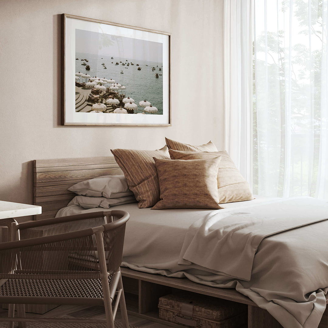 Drift into the calm of the Amalfi Coast with the Seaside Shades Art Print. Captured at La Scogliera in Positano, this pastel-toned photograph features soft white umbrella tops overlooking the serene Mediterranean sea, with boats scattered along the horizon. A soothing and elegant piece of Italian coastal wall art — perfect as a framed print or poster to bring tranquil Mediterranean beauty into your home.