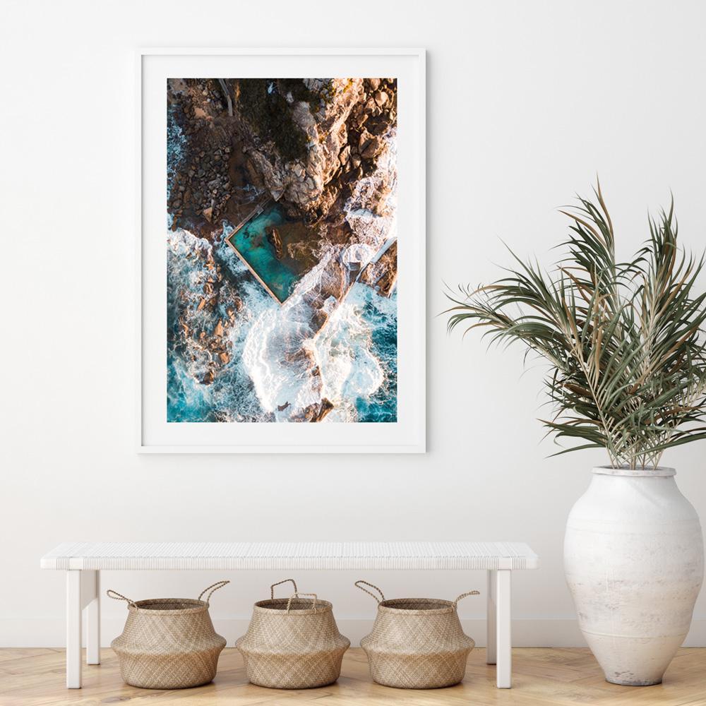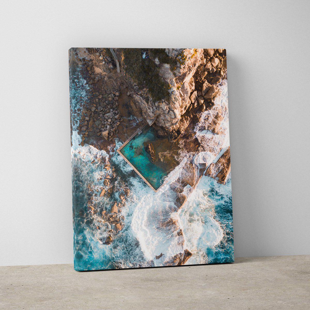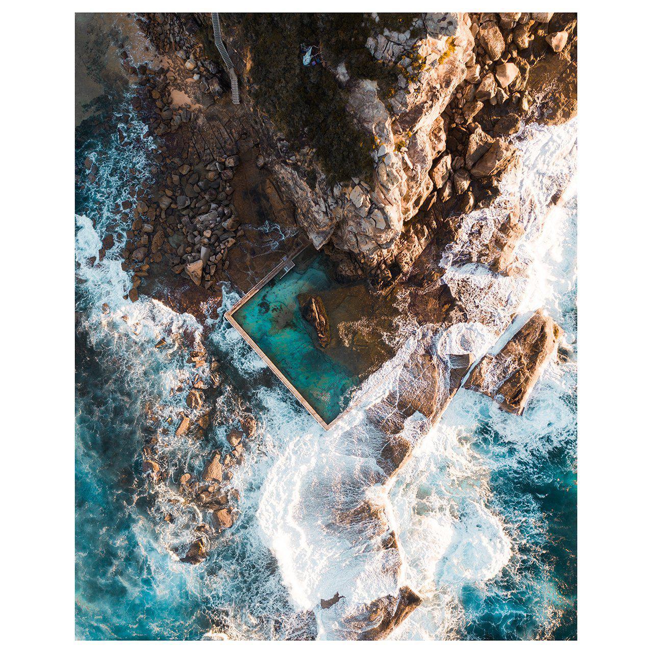 This Gem is situated on the Northern head of Curl Curl beach, and thanks to its subtle access is still undiscovered to many local residents. The clear lines of the pool give the otherwise abstract scene a pleasing contrast. On the day of the shoot, there was a 6 ft swell that gives a contrasting water cover over the rocks.
